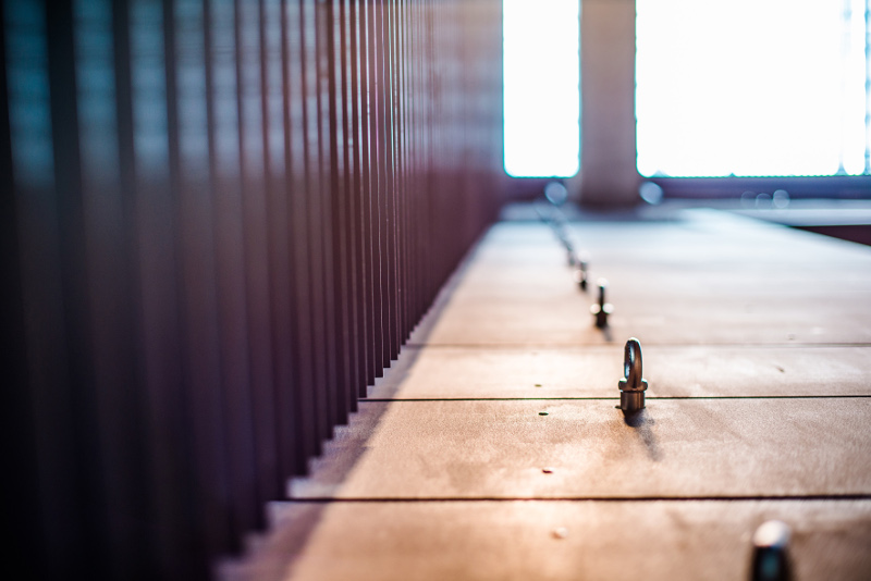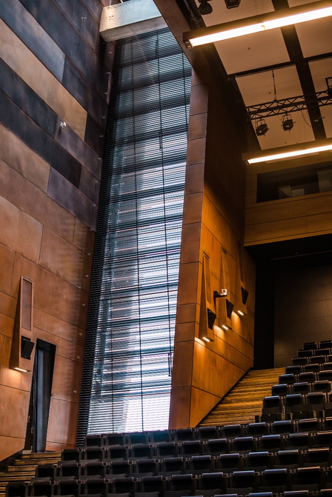 Gdańsk – Europejskie Centrum Solidarności Żaluzje wewnętrzne sunshield na świetliki dachowe oraz żaluzje wewnętrzne sunshield na elewację. Lamele ekstrudowane o szerokości 88 mm zapewniają 100% zaciemnienie w pomieszczeniach.